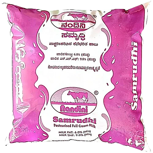 Nandini Samrudhi Milk is a rich and wholesome full cream pasteurized milk, carefully processed to retain its natural goodness. It is an excellent source of calcium and protein, making it a nourishing choice for all age groups. Packed with essential vitamins such as D and B12, Samrudhi Milk supports strong bones and healthy teeth while also contributing to overall vitality. Its creamy texture and rich taste make it perfect for direct consumption or for preparing tea, coffee, and a variety of delicious recipes.